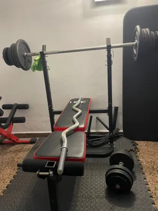 Equipo de gimnasio para entrenar en casa. - Press de banca con respaldo ajustable. - Barra Z. - Mancuernas con discos.