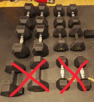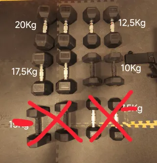 Vendo juegos de mancuernas en conjunto o individuales. 2'75€/kg Hago descuentos por llevarte varias 2 Mancuernas 20kg 110€ 2 Mancuernas 17,5kg 100€ 2 Mancuernas 12,5kg 70€ 2 Mancuernas 10kg 55€ Entrega en Mano.