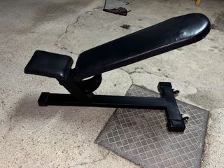 Vendo banco de pesas de la marca XMUND, ideal para press de banca, ejercicios de mancuernas y abdominales. • Multifuncional: Respaldo ajustable en varios niveles (inclina, declina y plano). • Diseño ergonómico: Acolchado de alta densidad con acabado en cuero sintético negro y detalles en rojo, muy fácil de limpiar. • Estable y seguro: Estructura de acero robusta con soportes antideslizantes y rodillos de espuma para fijar las piernas. • Ahorro de espacio: Es plegable, perfecto para guardarlo debajo de la cama o en un armario cuando no se usa. • Estado: Muy bien cuidado, sin roturas en el tapizado (ver fotos de detalle