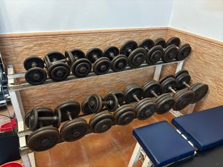 Conjunto de mancuernas y soporte para equipar tu gimnasio en casa. - Mancuernas de diferentes pesos. - Soporte metálico para organizar las mancuernas. Hay un mancuernero grande de 2.30x72 con mancuernas de 14 a 37.5 Hay un mancuernero pequeño de 1.00x57 Con mancuernas de 4 a 12 Y hay un soporte de barras fijas de 1.44 alto x 76 de ancho Con barras de 7,5 a 30 *SE PUEDE VENDER POR SETS PERO NO MANCUERNAS NI MANCUERNEROS SUELTOS*