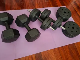 PRECIO NEGOCIABLE. Set de mancuernas ajustables de 10 kg ideal para entrenar en casa. Permite configurar diferentes pesos y usarlo tanto como dos mancuernas independientes o unirlas para formar una barra larga, ampliando los ejercicios posibles. Contenido del pack: 4 discos de 1,25 kg 4 discos de 1 kg 2 barras para mancuernas 1 barra extensora para convertirlas en barra larga 4 conectores/tuercas de seguridad para fijar los discos El sistema es ajustable, por lo que puedes añadir o quitar discos fácilmente según el nivel de entrenamiento. Ideal para trabajar brazos, pecho, hombros y espalda desde casa sin necesidad de gimnasio.