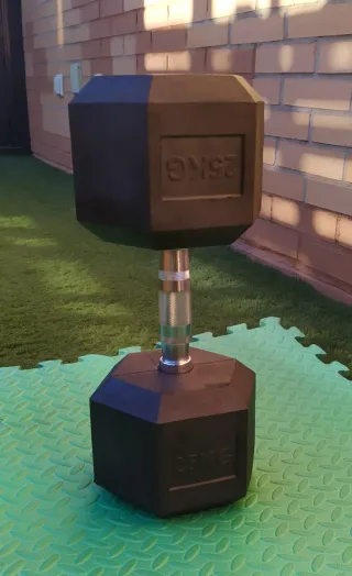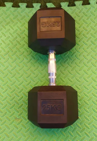 Par de mancuernas , 25 kilos cada una. Agarre ergonómico de cromo con canto para un agarre fijo. El exterior es de caucho antideslizante. Crossfit. ( Dos mancuernas de 25 kilos ( 120 euros) NO NEGOCIABLE.