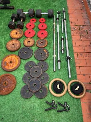 Vendo equipo completo de gimnasio en casa. Material de hierro macizo, muy duradero. Ayudo a cargar en coche. OFERTA LOTE COMPLETO: 290€ (Ahorras dinero y tiempo) DESGLOSE POR SEPARADO: • Mancuernas Fijas: Pareja 17,5kg (55€) | Pareja 12,5kg (40€). • Discos Salter Rojos (Pack 17kg): 2x1,5kg, 2x3kg, 2x4kg (40€). • Discos 10kg (4 unidades): 45€ el pack. • Resto Discos (30kg aprox): 50€. • Barras: Larga Salter (30€) | Kit 1 media + 2 cortas (20€). • Aros Gimnasia + Cinchas: 20€. • Hand Grips y cierres: 10€. Estado: Oxidación superficial por exterior (ver fotos), funcionalmente perfectos. No negociable si es por piezas sueltas.