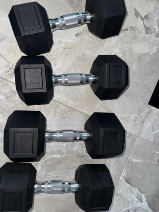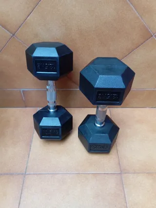 Se venden mancuernas hexagonales de gimnasio. - Dos mancuernas de 10kg cada una. - Dos mancuernas de 12.5kg cada una. - Diseño hexagonal para mayor estabilidad. - Agarre moleteado para un mejor control.