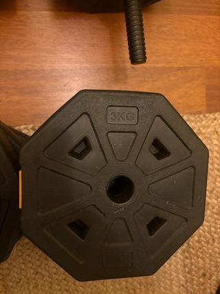 Set de mancuernas hexagonales ajustables, perfectas para tu rutina de ejercicios en casa. Su diseño permite variar el peso fácilmente. - Diseño hexagonal para mayor estabilidad. - Acabado en color negro con detalles naranjas. El ser se compone de 16 pesas de 3kgs con barra adicional para hacerla barra entera con las dos manuernas juntas. Poco uso, casi nuevo. Precio amazon 80€
