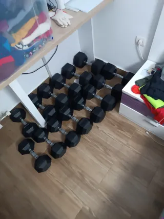 Conjunto de parejas de mancuernas hexagonales y 2 carros de transporte. Parejas de 12,5 kg - 15 kg - 17,5kg - 20 kg - 22,5 kg - 25 kg - 27,5 kg. En total 14 mancuernas nuevas sin estrenar. Fue un regalo y nunca se ha utilizado. Incluye dos carritos para su trasporte con ruedas multidireccionales que se pueden guardar debajo de una mesa. Precio 800 euros, costaron 1400 euros y están nuevas. Por el peso es preferible recogerlo en mano. Más fotos por privado.
