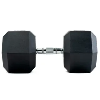 Par de mancuernas hexagonales de goma de la marca Bodytone. - Peso: 17.5 kg cada una. - Diseño hexagonal para evitar que rueden. - Empuñadura cromada con moleteado para un agarre seguro.