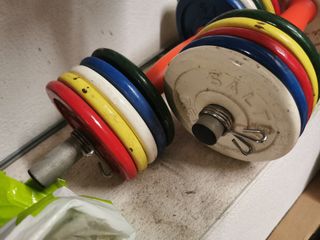 Conjunto de barras y discos de pesas Salter. - Dos barras cortas 45 cms + cierres - Una barra larga 120 cms + cierres - Dos discos de 3 kg. - Cuatro discos de 4 kg. Marca Salter