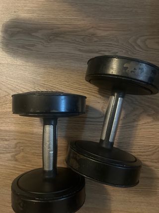 Par de mancuernas de la marca York, cada una con un peso de 15 kg. TAMBIEN: -2 MANCUERNAS TECHNOGYM DE 18KG CAUCHO (100€) -1 MANCUERNA DE 27.5KG (75€) - 4 Discos Olympicos 20KG 50mm 55€ / disco