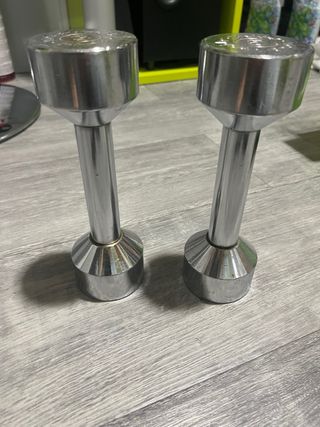 Juego de mancuernas fijas en perfecto estado. Ideales para tu entrenamiento en casa o gimnasio. - Varias mancuernas. - Soporte metálico para un almacenamiento ordenado. - Mancuernas en buen estado, con señales normales de uso. Mancuernas de 1kg. A 2€ por cada mancuerna. Palabras clave: gimnasio, gym, domyos, decathlon, pesa, pesa rusa, kettlebel, mancuerna, disco, peso, halterofilia, barra, cierre, pinza, barra, dominadas, gervasport, tentable, 25mm, 28mm, 30mm, barra romana, barra h, barra z, zeta, banco, press, banca, bodypump, 1kg, 2kg, 5kg, 10kg, 20kg, olímpica.