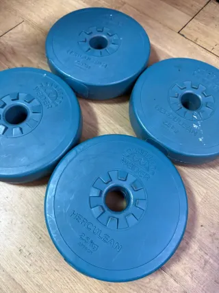 Se venden cuatro discos de pesas Weider Herculean. - Cada disco pesa 2.5 kg. - Dos discos de 1kg. - Color azul. - Diseño con orificio central.