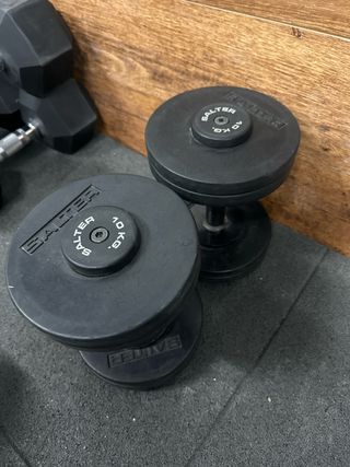 Par de mancuernas SALTER de 8kg cada una. Ideales para entrenamientos. - Peso: 8 kg por mancuerna. - Marca: SALTER. - Diseño redondo.