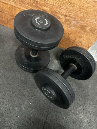 Par de mancuernas de 35kg cada una, perfectas para entrenamientos de fuerza. - Peso: 35 kg por mancuerna. - Material: Goma y metal. una de ellas le falta un poco de goma