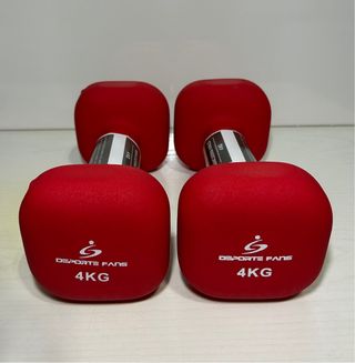 Par de mancuernas de neopreno color rojo, cada una con un peso de 4 kg. Ideales para entrenamientos en casa. - Color: Rojo - Peso: 4 kg cada una - Material: neopreno