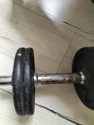 Set de mancuernas ajustables de 30 kg. Todo esta nuevo - Incluye 2 barras para mancuerna con antigrip. - Incluye 1 barra conectora revestida de espuma para conversion a barra. - Incluye 4 discos de 2,5kg; 4 discos de 2kg; 4 discos de 1,5kg y 4 discos 1,25kg. - Discos recubiertos de plastico resistente.