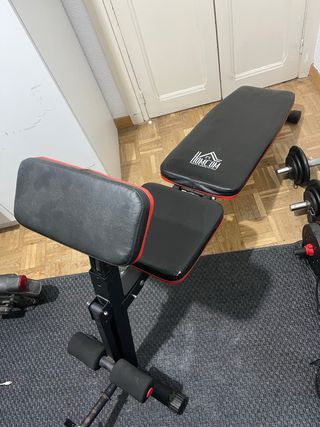 Equipo de gimnasio para entrenar en casa. - Banco de pesas ajustable. - Juego de mancuernas con discos. Está completamente nuevo, nunca se ha usado