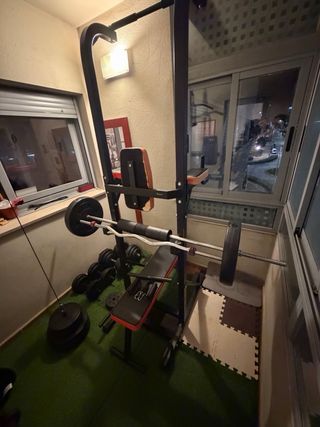 Se vende equipo de gimnasio en muy buen estado, ideal para entrenar en casa y de regalo una mesa de Ping pong con 5 palas. - Banco de pesas ajustable. - Barra de pesas con discos. - Mancuernas. - Barra Z.