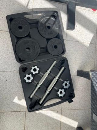 Set de mancuernas ajustables para entrenar en casa. Incluye barras, discos y cierres. - Dos barras de mancuerna. - Cuatro discos de 2.5 kg. - Seis discos de 1.25 kg. - Dos discos de 5 kg. - Cuatro cierres de estrella.
