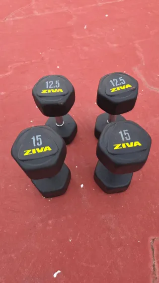 Set de mancuernas hexagonales ZIVA. - Dos mancuernas de 12.5 kg cada una. - Dos mancuernas de 15 kg cada una. - Diseño hexagonal para mayor estabilidad.