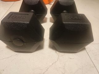 Se vende lote de mancuernas y accesorios para entrenamiento. - Mancuernas de 8 kilos. - Discos de 2 kilos: 4 unidades (16 €). - Discos de 1 kilo: 4 unidades (8 €). - Barra de 2 kilos: 2 unidades (20 €). - Precio total del lote: 44 €.