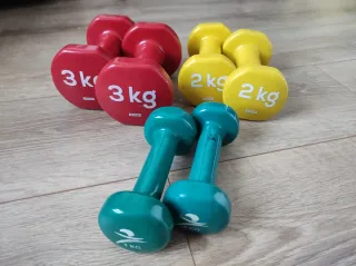 Conjunto de mancuernas de diferentes pesos para entrenar en casa. - Dos mancuernas de 1 kg cada una (color verde). - Dos mancuernas de 2 kg cada una (color amarillo). - Dos mancuernas de 3 kg cada una (color rojo).