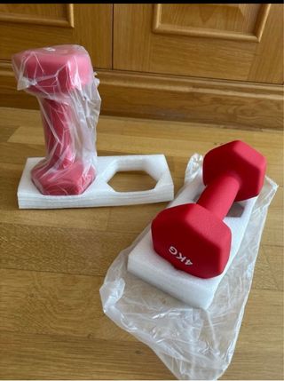 Par de mancuernas de 4 kg cada una, ideales para entrenamientos en casa. - Color: Rojo. - Peso: 4 kg por mancuerna. - Material: Revestimiento exterior. Se venden por no usar.
