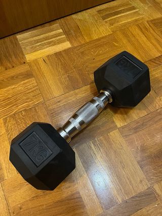 Está en muy buen estado, como se puede apreciar en las fotos. - Mancuerna de 7 kg. - Diseño hexagonal. - Empuñadura de metal. - Ideal para ejercicios de fuerza.