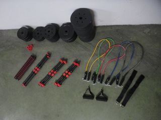 Kit de mancuernas y discos para entrenamiento de fuerza. Incluye barra y discos de diferentes pesos. Material: Hierro fundido. Peso total: 50 kg. - Barra 8 kg desmontable. - Dos mancuernas (2 kg cada una) - Discos de 5 kg (4 unidades). - Discos de 2 kg (8 unidades). - Discos de 0.5 kg (4 unidades) - Cierres para barra.