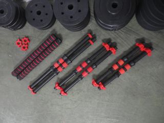 Set de mancuernas ajustables con discos de peso. - Mangos con agarre antideslizante. - Discos de peso negros. - Cierres de rosca rojos para asegurar los discos. 4 de 2kg, 4 de 2,5kg; 2 de 1,25kg; 2 de 1kg; 2 de 2kg; 2 de 2,5kg