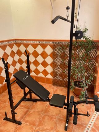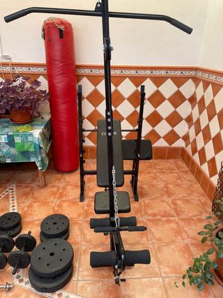Equipo de gimnasio completo para entrenar en casa. - Banco de press de banca. - Barra de pesas. - Mancuernas. - Discos de pesas. Puedes hacer muchos ejercicios