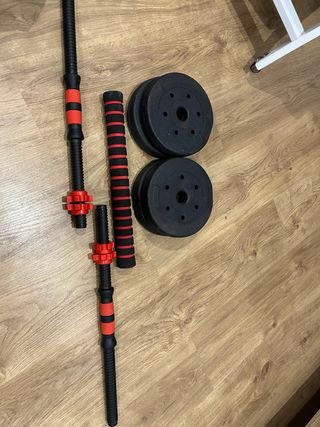 Set de mancuernas con discos de peso. El peso total de cada mancuerna puede llegar hasta los 20kg. - Discos de peso. - Barras para mancuernas.