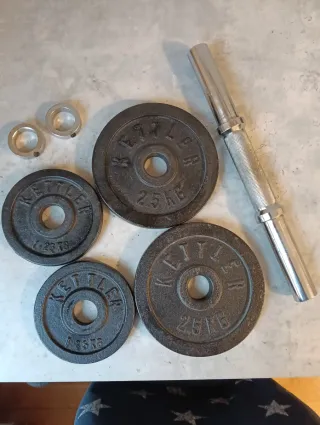 Conjunto de equipamiento para entrenamiento de fuerza. - Barra Z cromada. - Dos mancuernas cortas con rosca. - Dos discos de 10 kg (22 lbs) cada uno. Con las mancuernas pequeñas y un monton de discos lo dejo en 120