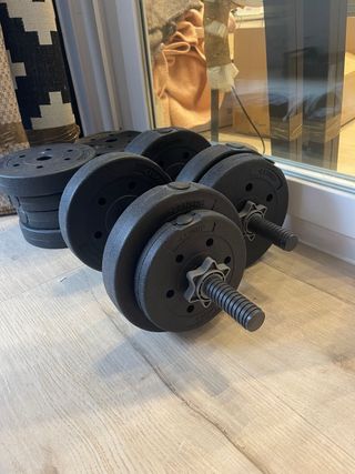 Kit de mancuernas DOMYOS de 20kg, ideal para entrenar en casa. Incluye barras y discos. Comprado en pandemia, muy poco uso (1 meses), ya se me quedan pequeñas. - Dos barras de mancuerna (35cm, 2kg) - Cuatro discos de 2 kg (4,4 lbs). - Ocho discos de 1 kg (2,2 lbs). - Cuatro cierres para discos.