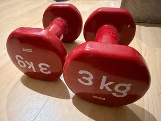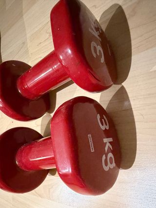 Par de mancuernas rojas de 3 kg cada una. Ideales para entrenamientos en casa. - Peso: 3 kg por mancuerna. - Color: Rojo. - Marca: Decathlon.
