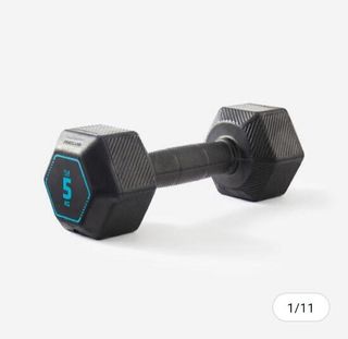 Par de mancuernas Domyos de 5 kg cada una. Ideales para entrenamientos de fuerza. - Peso: 5 kg por mancuerna. - Diseño hexagonal para evitar que rueden. - Empuñadura texturizada para un agarre seguro.