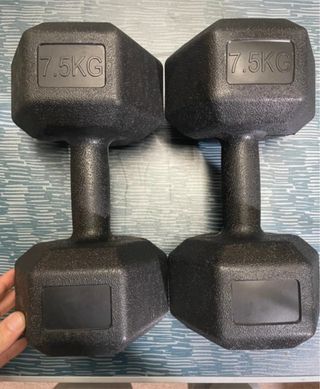 Par de mancuernas de 7.5 kg cada una, perfectas para tu rutina de ejercicios. - Peso: 7.5 kg por mancuerna. - Diseño hexagonal para evitar que rueden