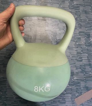 Mancuerna tipo kettlebell con un peso de 12 kg. Ideal para entrenamientos de fuerza y acondicionamiento físico. - Color verde menta. - Diseño ergonómico para un agarre cómodo.