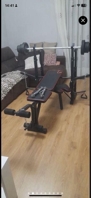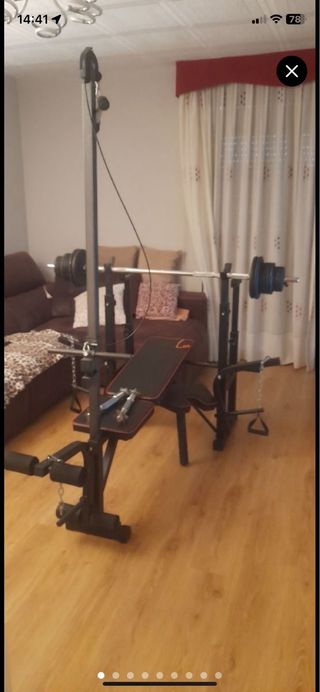 Se vende equipo de gimnasio completo para entrenar en casa. - Dos discos de 25 kg. - Dos discos de 10 kg. - Cuatro discos de 2,5 kg. - Dos mancuernas cortas. - Barra larga de pesas. - Banco regulable. - Curl de quadriceps integrado. - Polea alta integrada.