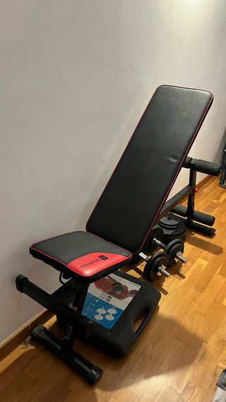 Banco de gimnasio inclinable con diseño moderno y acolchado. Perfecto para hacer pesas y abdominales, está como nuevo. Tapicería negra y detalles en rojo, estructura robusta para entrenamientos y soporte para piernas ajustable. Lo vendo porque me mudo y ya no lo necesito. Nuevo me valió 120€. Si compras tambien las mancuernas o los discos de 5kg te hago descuento! TIRADO DE PRECIO!!!
