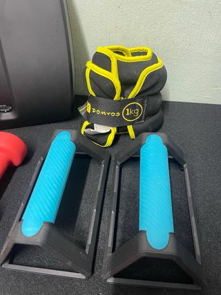 Lote de equipamiento para entrenar en casa. - Dos mancuernas rojas de 1.5 kg cada una. - Dos barras para flexiones con mangos azules. - Cojin para hacer abdominales. - Un par de pesas de tobillo/muñeca de 1 kg cada una. Se vende por separado tambien. #mancuernas #pesasgym #pesasencasa #fitness #gymencasa #entrenamiento #musculacion #fuerza #domyos #decathlon #materialdeportivo #equipodegym #homegym #pelotadejercicios