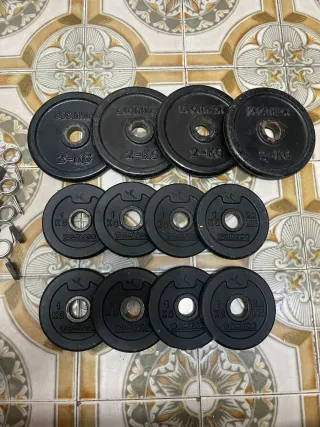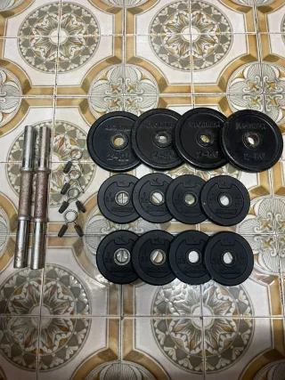 Set de pesas y mancuernas para entrenamiento. - 4 discos de 2 kg (Decathlon) - 8 discos de 1 kg (Domyos) - 2 barras de mancuerna - 4 cierres para mancuerna #pesas #mancuernas #mancuernasajustables #pesasgym #pesasencasa #fitness #gymencasa #entrenamiento #musculacion #fuerza #domyos #decathlon #materialdeportivo #equipodegym #homegym