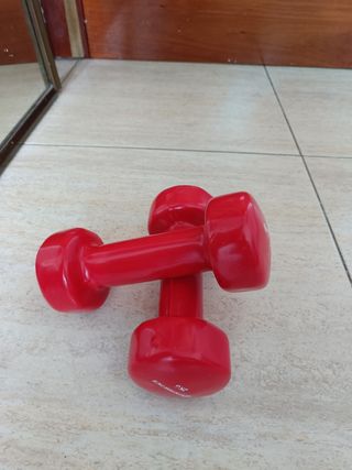 Par de mancuernas de color rojo, cada una con un peso de 2 kilogramos. Ideales para entrenamientos. - Peso: 2 kg cada una. - Color: Rojo. SOLO ENVIOS EN CANARIAS No leer : mancuernas , ejercicio , gym , mancuernas 2kg , pesas , peso , gimnasio