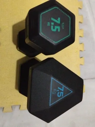 Par de mancuernas de 7.5 kg cada una, ideales para entrenamientos en casa o gimnasio. - Peso: 7.5 kg por mancuerna (16.5 lb). - Diseño hexagonal para evitar que rueden. - Empuñadura texturizada para un agarre seguro.