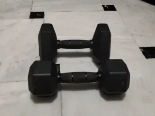 Se venden cuatro mancuernas para entrenamiento. - Dos mancuernas de 20 kg cada una. - Dos mancuernas de 25 kg cada una. - Diseño hexagonal para mayor estabilidad.