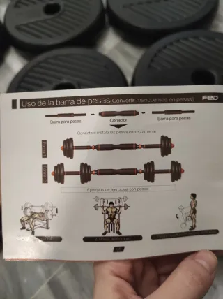 Set de pesas para entrenamiento en casa. - Barra Z. - Mancuernas unificables. - Soporte y discos: 4*0'5kg, 4*1'25kg, 4*2.5kg, 4*5kg, 4*10kg.