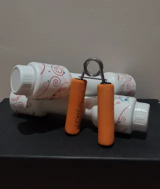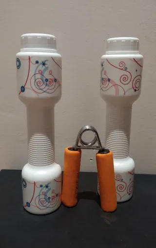 Aparato de ejercicio para fortalecer los dedos y las manos. Cuenta con mangos de espuma de color naranja para un agarre cómodo. Apenas usado. - Mangos de espuma naranja de 9 cm. - Estructura metálica con muelle. - Diseño ergonómico. Las mancuernas son de plástico duro y resistentr (25 x 7 cm. aprox.), cuentan con tapón de rosca cómodo de usar y se llenan con agua para que pesen hasta 485 g. cada una; también se pueden rellenar con tierra o con piedras para modificar su peso.