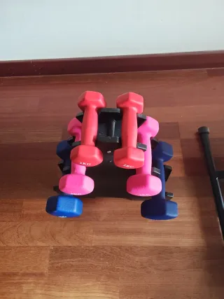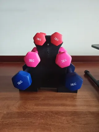 Set de mancuernas de neopreno. Incluye mancuernas de diferentes pesos. - Mancuernas de 1 kg (rojas) - Mancuernas de 2 kg (rosas) - Mancuernas de 3 kg (azules) - Soporte organizador incluido (está un poco inclinado por el peso pero aún se mantiene de pie)