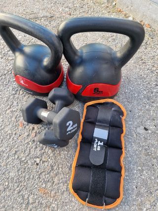 Lote de equipamiento deportivo para entrenar en casa o al aire libre. Incluye dos mancuernas de 2kg cada una y dos pesas rusas (kettlebells) de 4kg y 6kg. - Dos mancuernas de 2kg cada una. - Una pesa rusa (kettlebell) de 4kg. - Una pesa rusa (kettlebell) de 6kg. - muñequeras/tobilleras de 1 kg