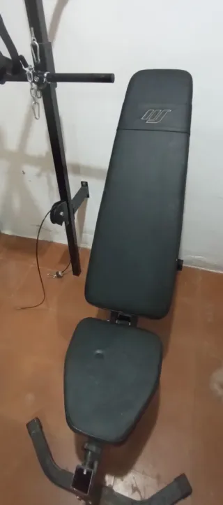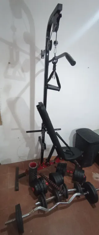 Se vende equipo de gimnasio completo, ideal para entrenar en casa. Incluye una máquina multifuncional y varias pesas. - Máquina de musculación con poleas y accesorios. - Banco de entrenamiento ajustable. - Barra de pesas. - Mancuernas. - Discos de pesas de diferentes tamaños. - Rodillo de espuma para masaje muscular.
