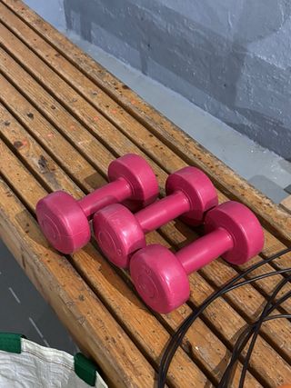 Conjunto de equipamiento para entrenamiento de fuerza y core, con muy poco uso. - Barra - Dos barras de mancuerna con agarre texturizado. - Rueda abdominal con doble rueda para mayor estabilidad.